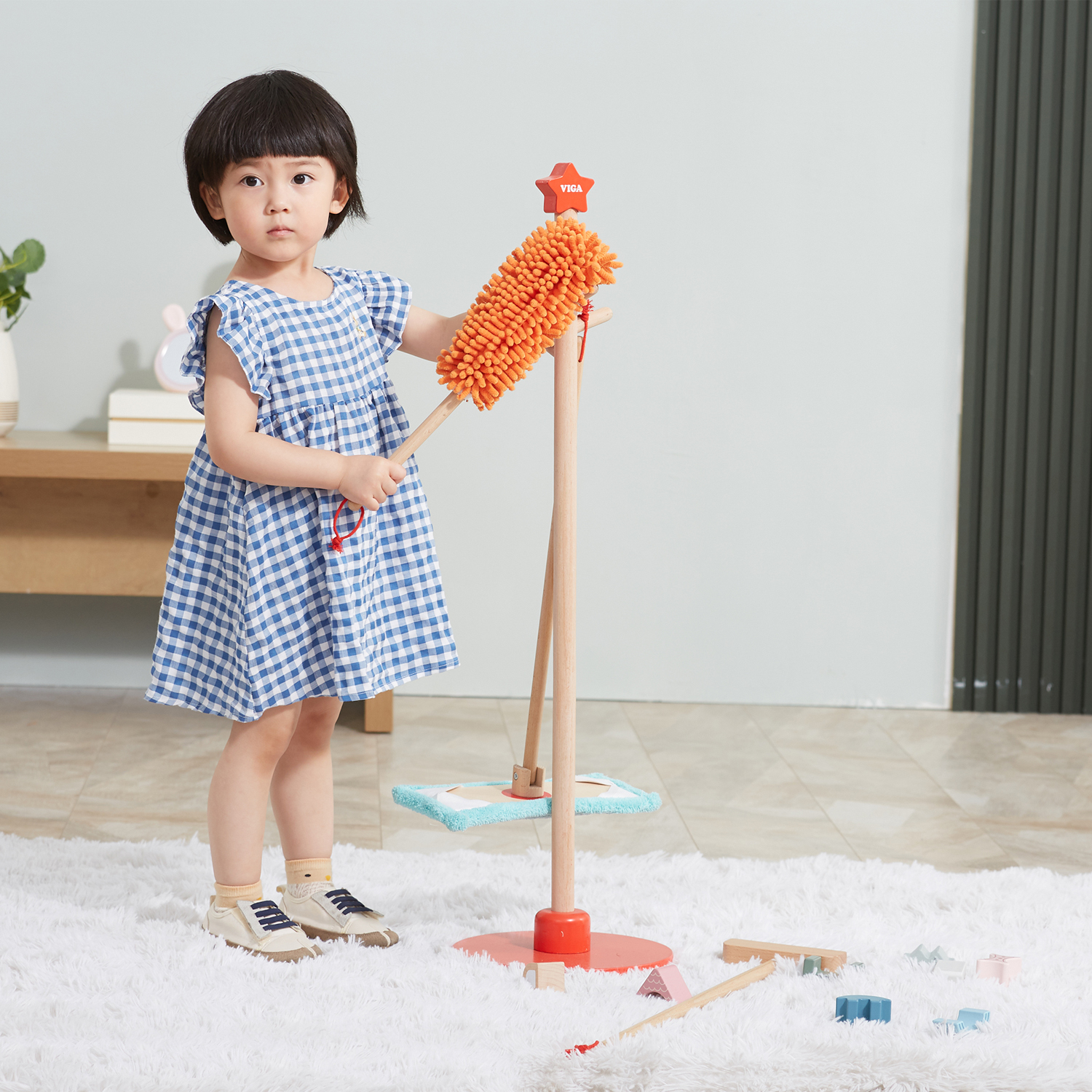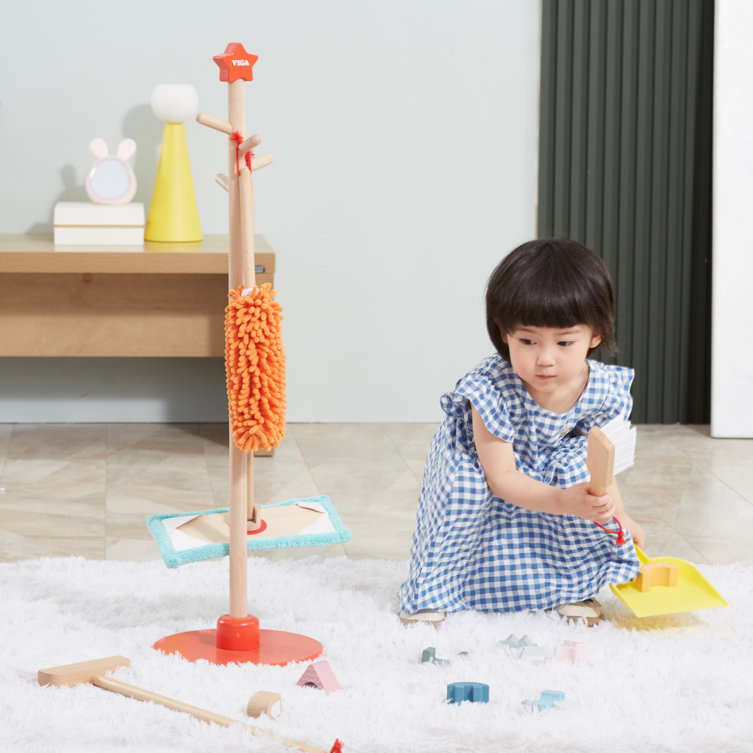 Includes: wooden stand with broom, mop, duster, brush and dustpan