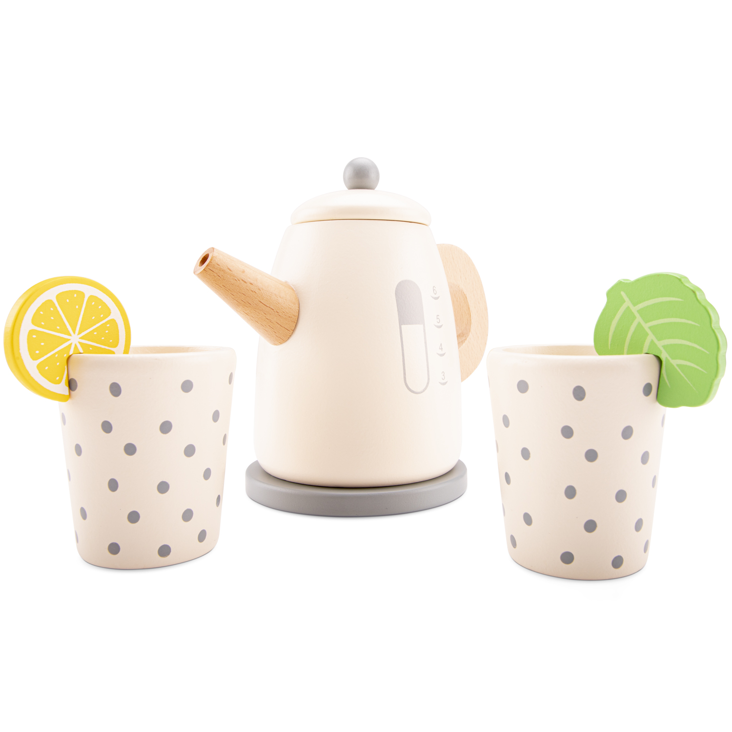 Get ready to host a delightful tea party with this wooden kettle by New Classic Toys. Designed with a realistic look, including a sturdy handle and a pouring spout, this wooden kettle is perfectly sized for little hands. Watch as your child engages in imaginative play, brewing and serving their own pretend tea creations. The set also includes a mint leaf and a lemon slice, adding an extra touch of fun to their tea-making adventures. With two cups included, they can enjoy their tea with friends or their beloved toys, encouraging the development of social skills. Inspire your little one’s creativity with this wooden kettle toy, a wonderful addition to any play kitchen. Made from FSC® 100% certified wood.