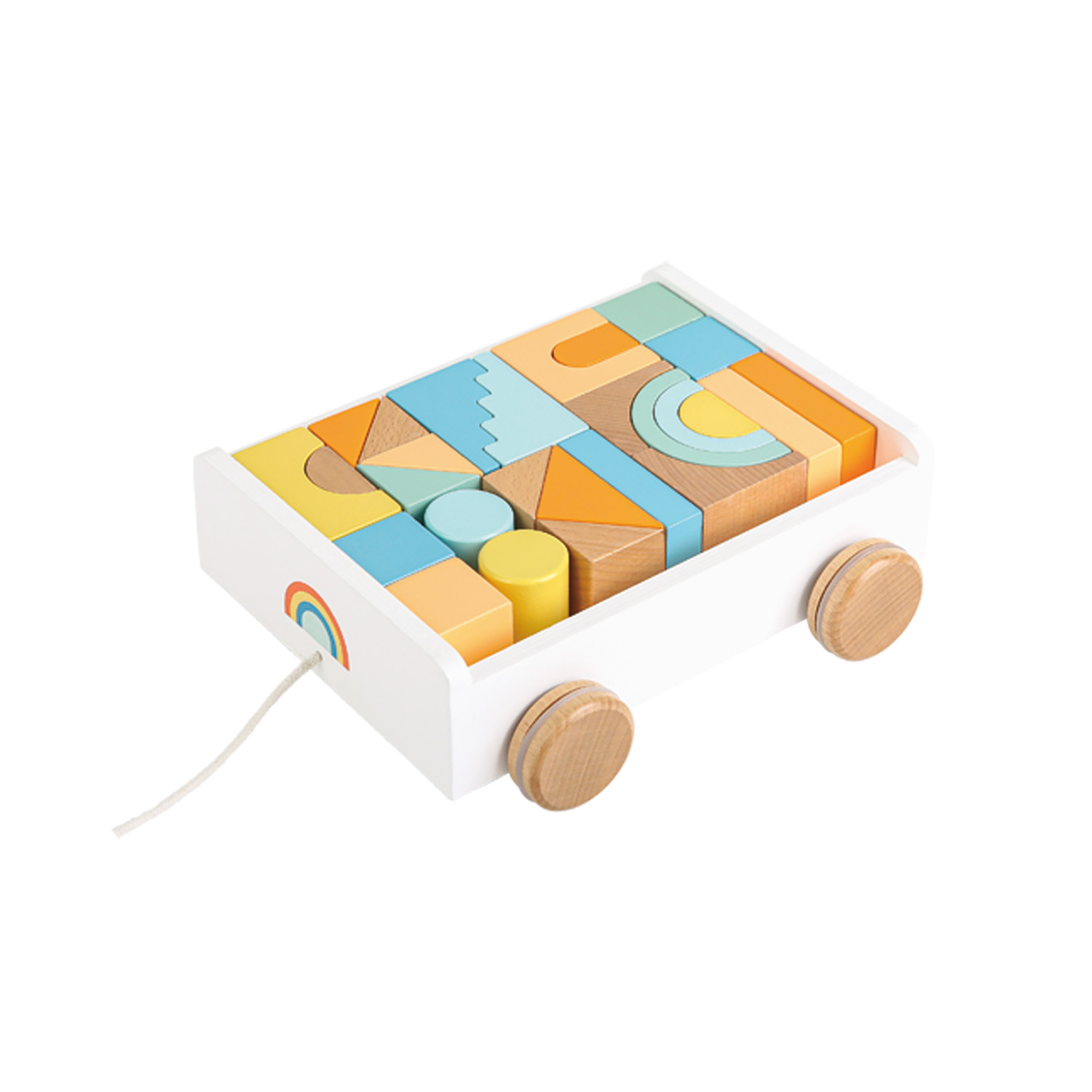This elegant wooden toy pull along block wagon from Lelin® is filled with colourful wooden blocks in a variety of shapes and sizes. Children can stack, build and sort the 26 blocks, then pull the wagon along to take their creations on the move.