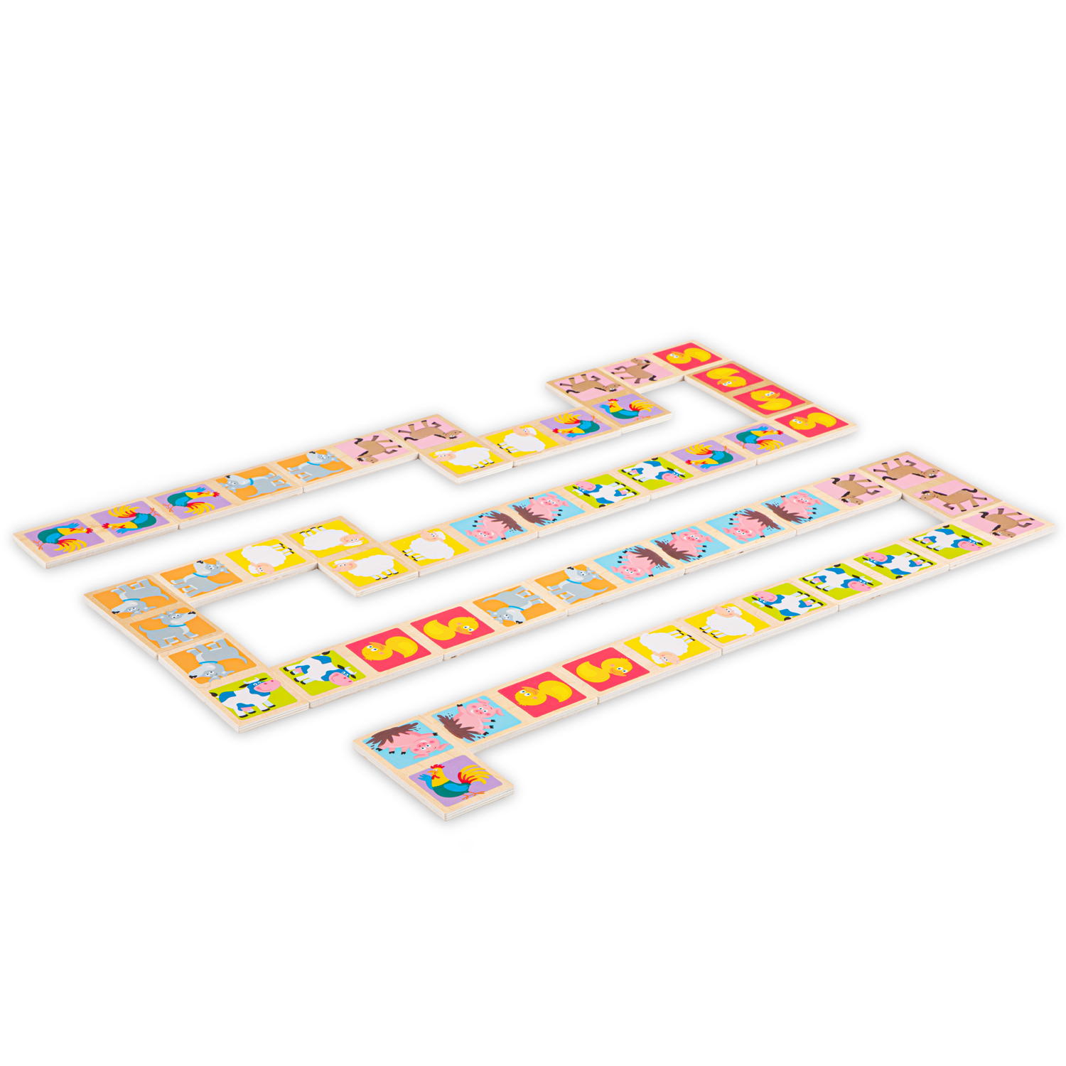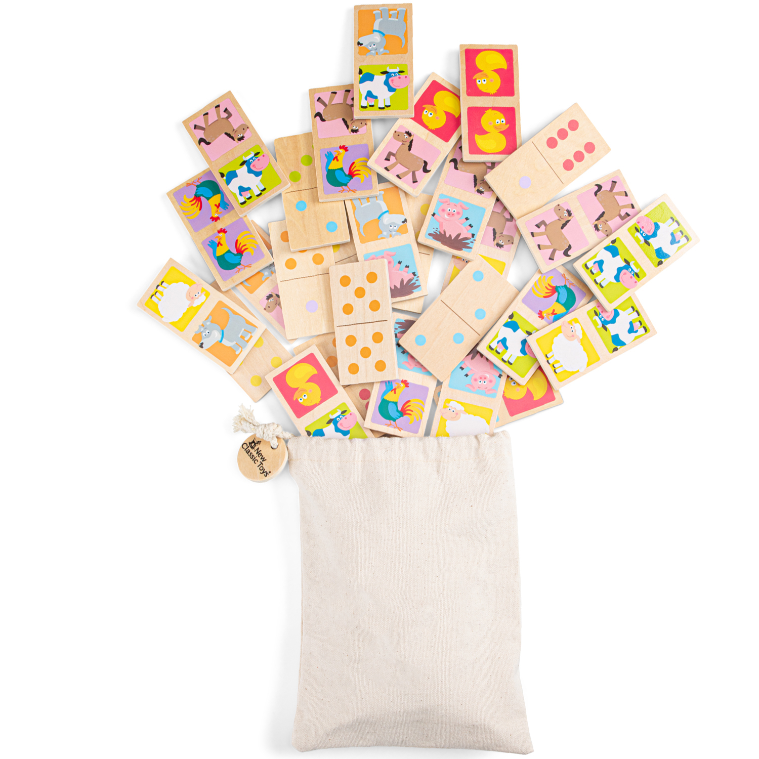 This wooden domino game by New Classic Toys is a perfect game for little ones. It has 28 double-sided dominoes featuring friendly farmyard animals on one side and dots on the other side. Playing this game is an excellent activity for developing fine motor skills, problem-solving abilities and training your logical thinking. Encourages social play while little ones develop recognition and speech skills. Game rules: put all the dominos face-down on the table and mix them up. Each player takes 6 dominoes, if there are more than 3 players each player should only take 3. Don't let the other players see your dominoes! Players take turns to match to match the domino pieces. The winner is the first player that gets rid of all their dominoes. Comes with a cotton bag for easy storage. This domino game is made of FSC® 100%-certified wood.