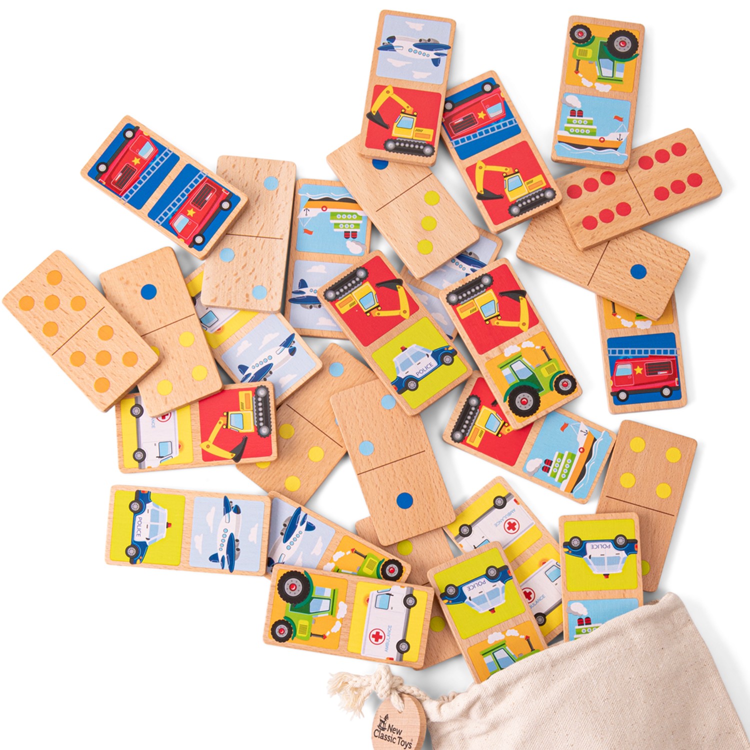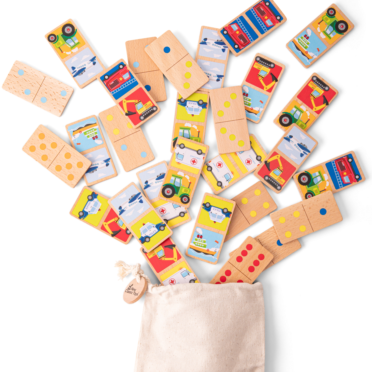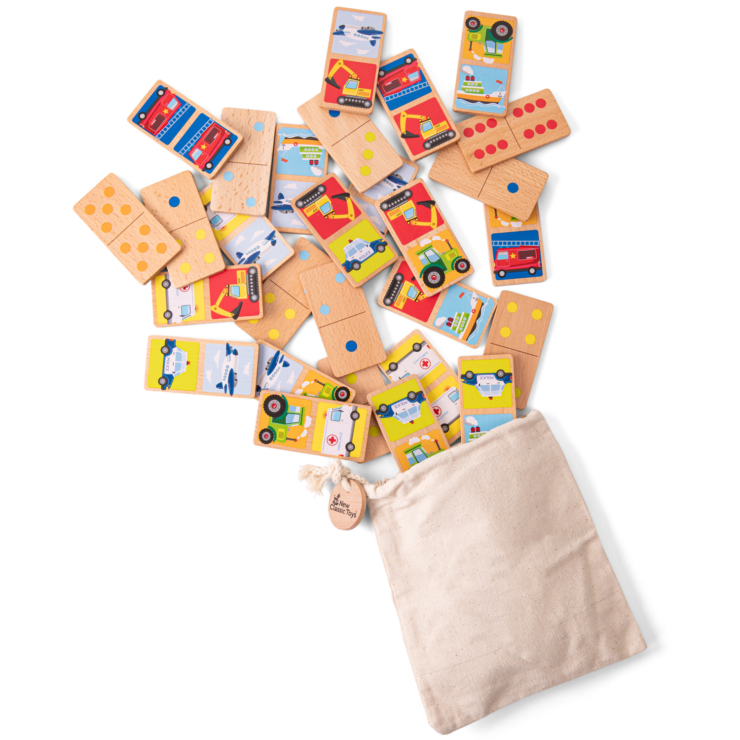 This wooden domino game by New Classic Toys is a perfect game for little ones. It has 28 double-sided dominoes featuring vehicles on one side and dots on the other side. Playing this game is an excellent activity for developing fine motor skills, problem-solving abilities and training your logical thinking. Encourages social play while little ones develop recognition and speech skills. Game rules: put all the dominos face-down on the table and mix them up. Each player takes 6 dominoes, if there are more than 3 players each player should only take 3. Don't let the other players see your dominoes! Players take turns to match to match the domino pieces. The winner is the first player that gets rid of all their dominoes. Comes with a cotton bag for easy storage. This domino game is made of FSC® 100%-certified wood.