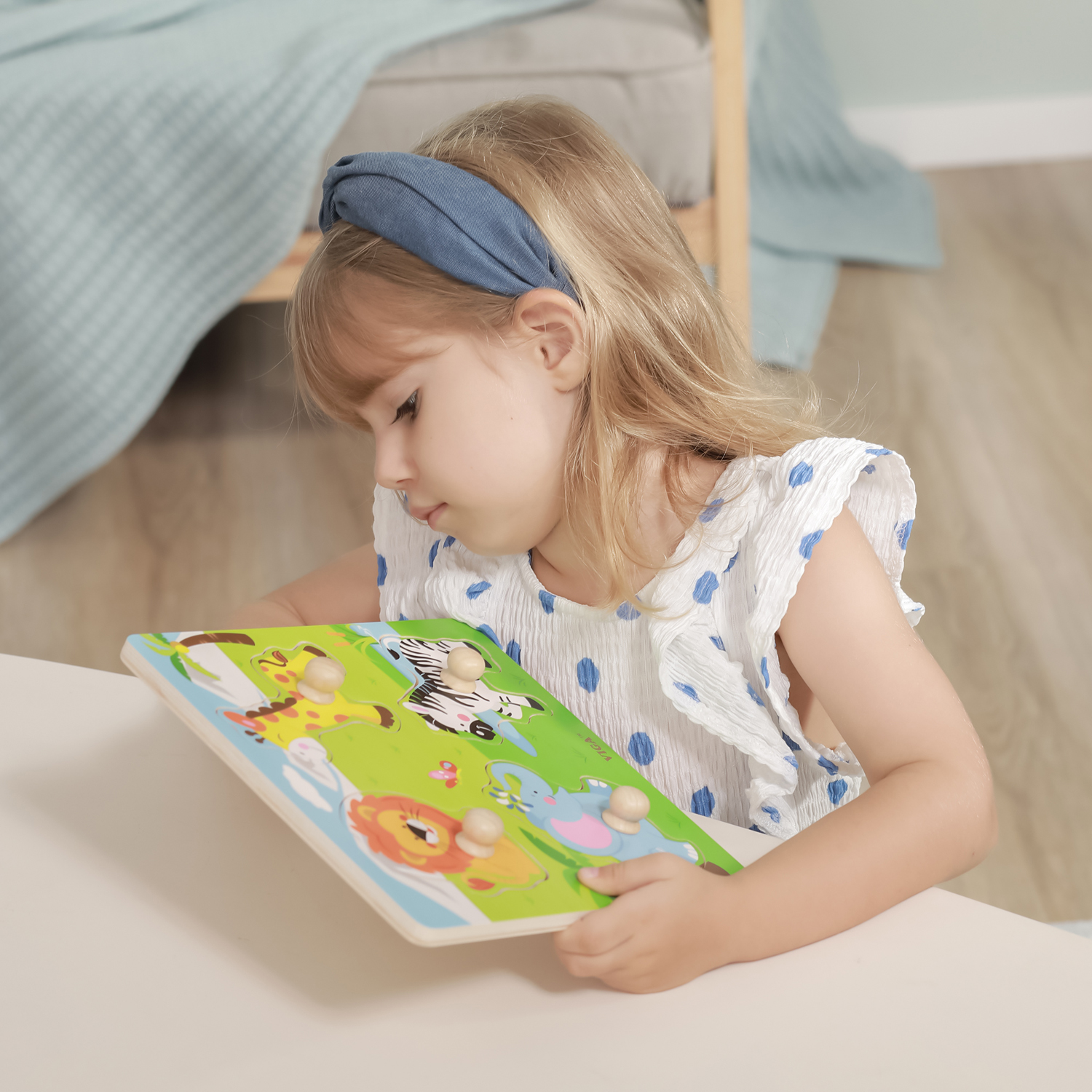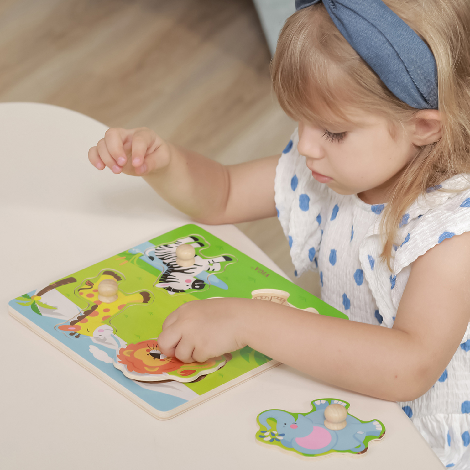 Using the related images underneath and the pieces on top, this simple flat puzzle can stimulate the logical thinking of little children at their early stage.