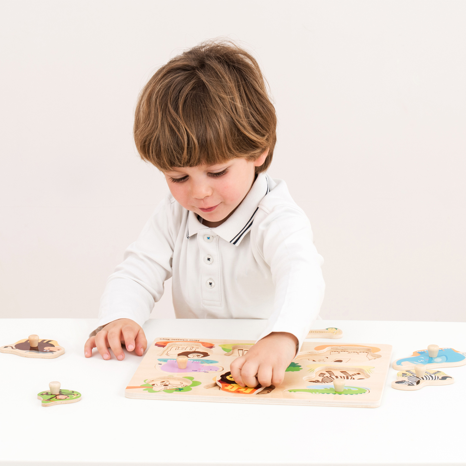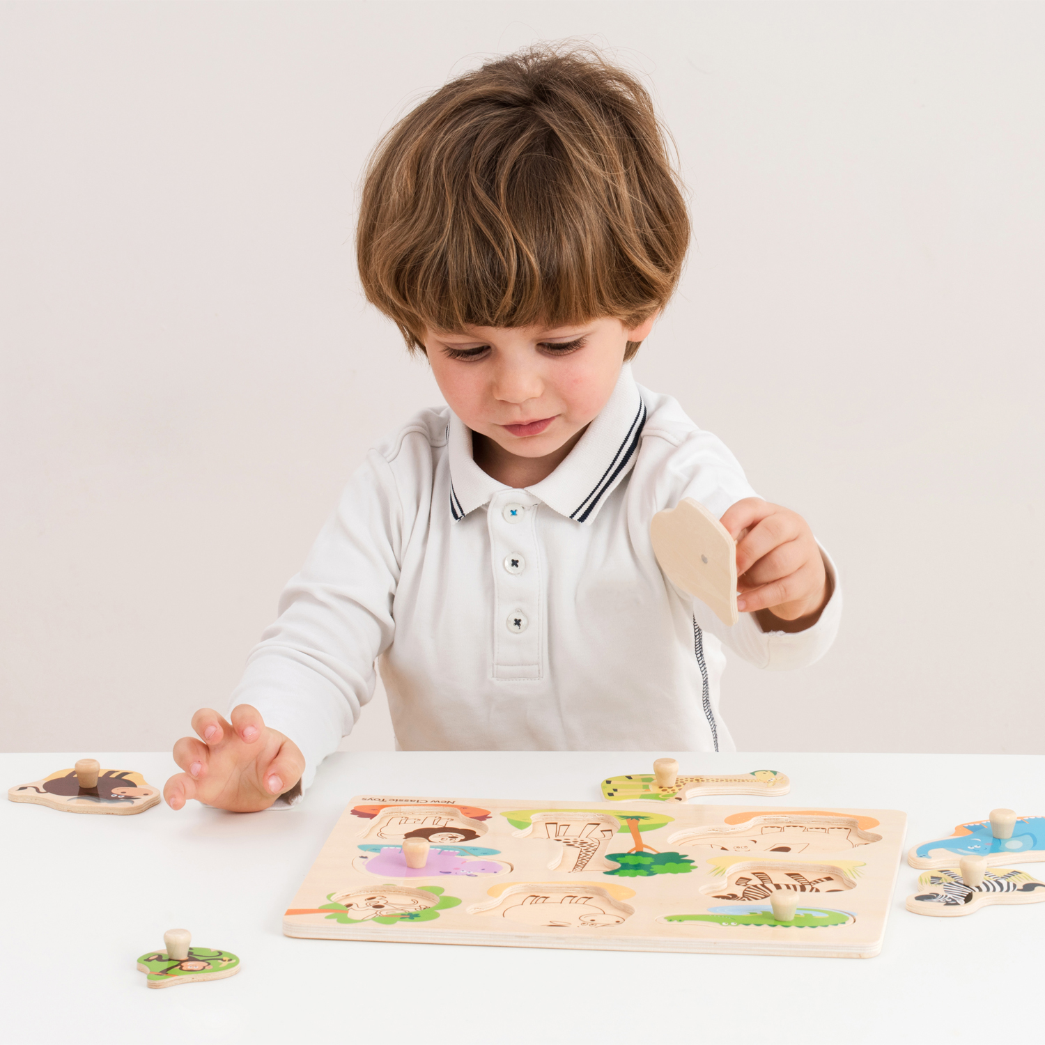 Go on an adventure with this wooden safari themed peg puzzle from New Classic Toys. Featuring a crocodile, a cape buffalo, a monkey, a zebra, a giraffe, a hippo, an elephant and a lion. The pictures under the puzzle pieces make solving the puzzle easy and fun. All puzzle pieces feature a pegged handle making it easy to grasp each piece and place it back in the correct spot. Puzzles help children develop valuable skills through an activity that they enjoy, like developing their fine motor skills and improve their hand-eye coordination. It's also good for training their memory, it stimulates the recognition of shapes, colors and pictures.