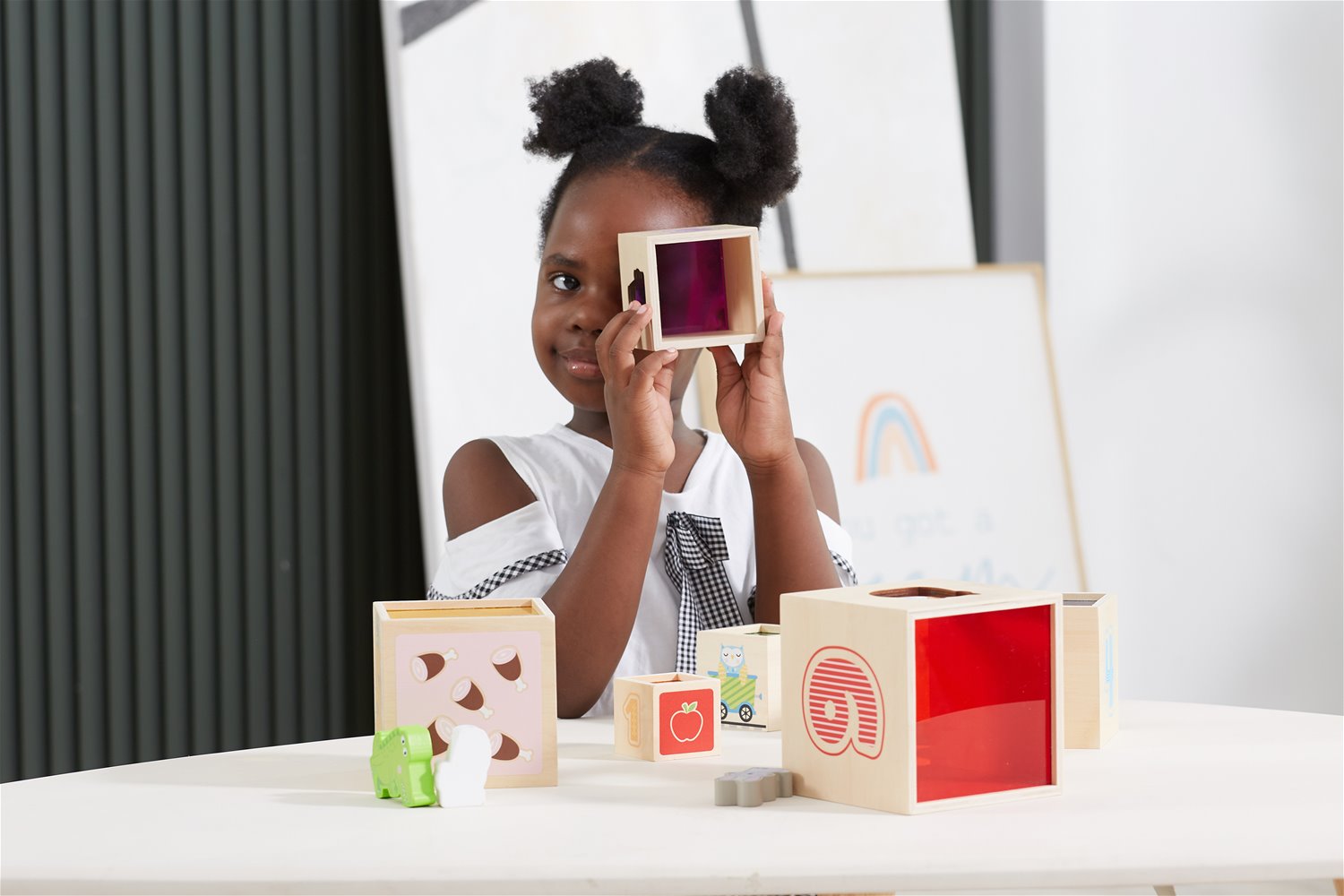 These colourful wooden nesting and stacking blocks from Viga Toys® introduce little ones to shapes, colours, animals and numbers through play. The set includes six blocks of different sizes, each with cheerful illustrations and a see-through coloured panel that create beautiful light reflections when sunlight passes through.
