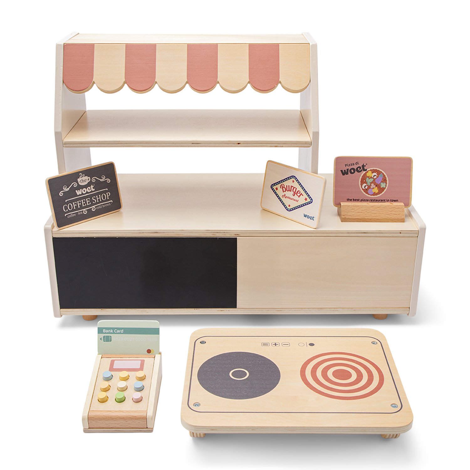 With the Woet® Wooden Shop and Restaurant Play Set every day brings a new story, from cooking and serving to running a busy little shop. A timeless wooden toy that children will enjoy for years.