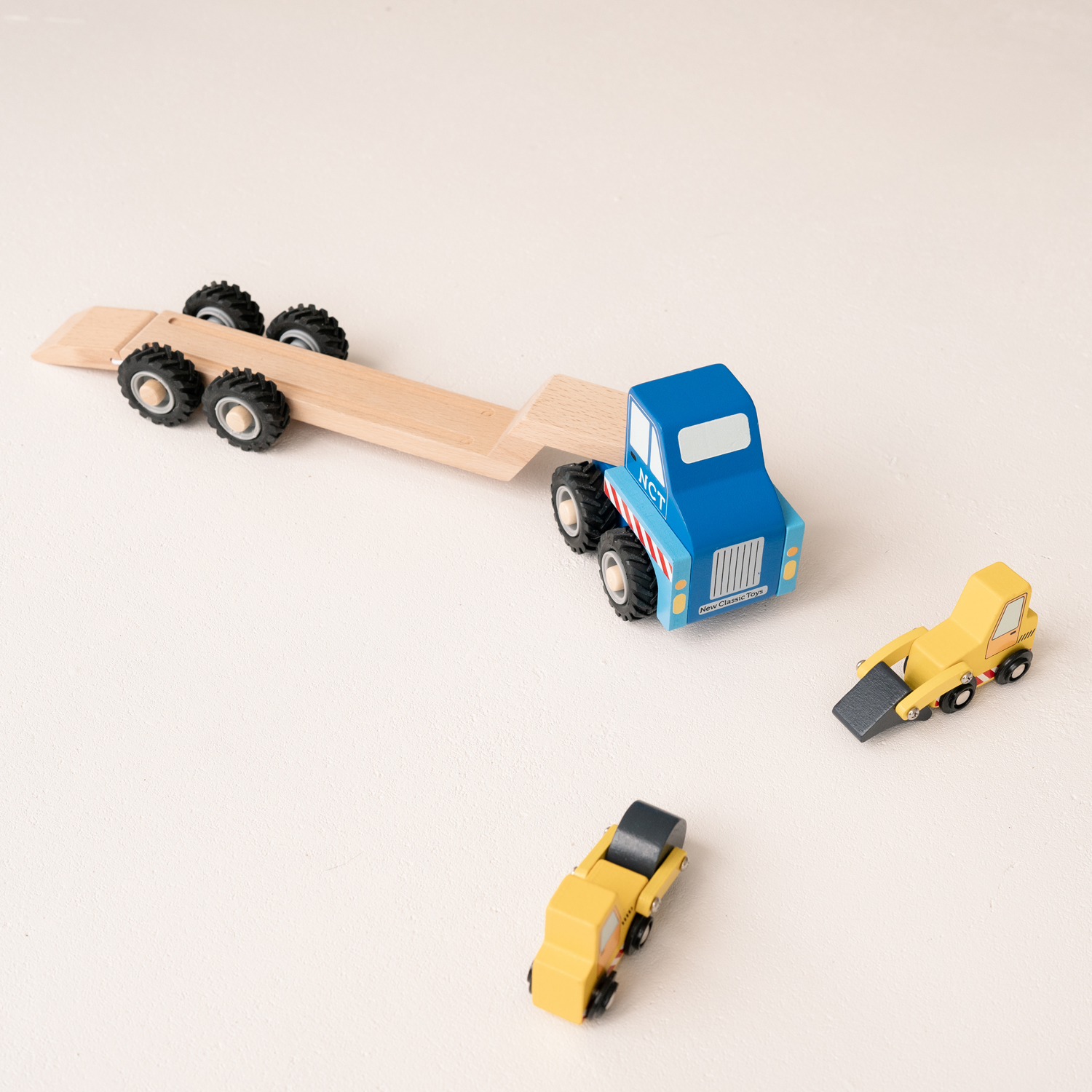 Children adore toy vehicles. Zooming, beeping, racing, crashing, parking. This wooden car transporter with two construction vehicles from New Classic Toys is the perfect addition to any collection. Featuring a road roller and a front loader and the trailer can be disconnected from the truck. Load and unload the construction vehicles from the trailer, lock the tailgate and go! Little ones can pretend play working on their own construction sites while driving the vehicles around. It inspires imaginative play and allows storytelling skills to flourish. Role playing is an effective way for children to make sense of the world around them.